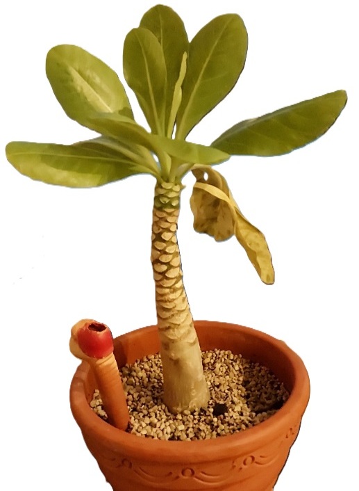 Als Konsequenz durfte meine kleine Dramaqueen umziehen. Mit immer wieder wenig Wasser (grün war sie ja oben) und Ruhe hat sich der Stamm tatsächlich erholt und wurde langsam wieder fest. Wirklich langsam. Die ersten Tage habe ich kaum einen Unterschied gefühlt. Nach ca. einer Woche wurde es besser und die Hawaiipalme hat sich erholt. Dachte ich. Die verbliebenen Blätter standen wieder aufrecht. Unten am Stamm kann man übrigens erkennen wie viel sie in den letzten Monaten gewachsen ist (der dunkelgrüne Teil) und dass sie ca. die Hälfte der Blätter bis dahin geopfert hatte.
