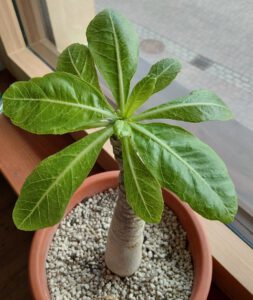 - Sie mag Wasser, aber nicht zu viel. Der Stamm speichert Wasser und sie mag absolut keine nassen Füße. -> Also eher gießen wie eine Sukkulente.