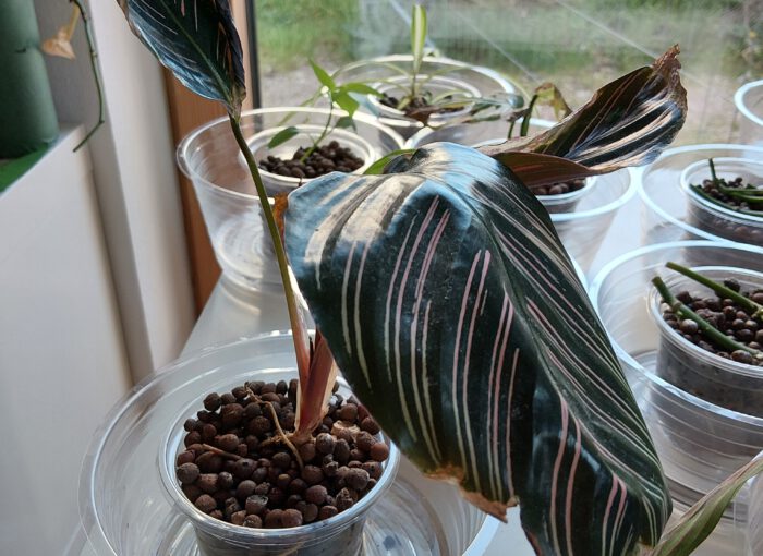 Die Korbmarante hatte ich vor ziemlich genau 4 Wochen aus dem Topf herausgeholt und das Rhizom in 3 Teile geteilt. Das Teil, das noch Blätter hatte, hat sich am besten entwickelt. Im Topf sieht man, dass sie gesunde Wasserwurzeln entwickelt hat, die gut wachsen. Und oben wächst zu meiner großen Freude ein neues Blatt.